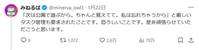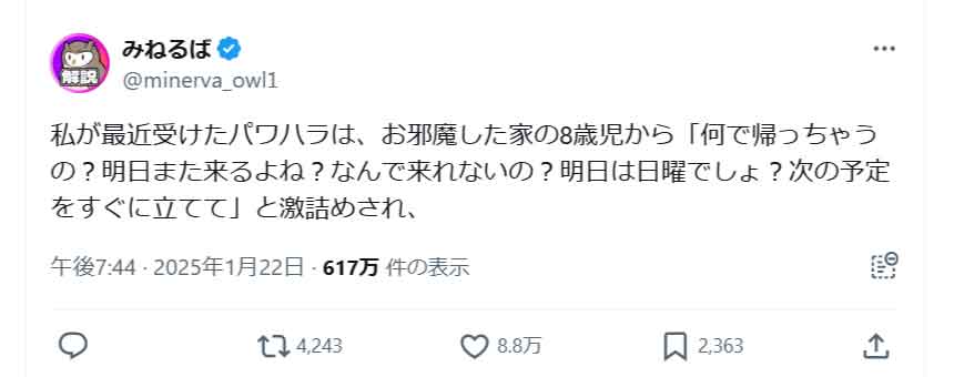 話題 「私が最近受けたパワハラ」 “激詰め”や厳しいタスク管理の要求されるも…ほっこりする人が続出した理由とは 公開日:2025.01.27 / 更新日:2025.01.27 著者:Hint-Pot編集部 B! 育児SNS子ども 【画像】「私が最近受けたパワハラ」 ユーモアたっぷりな実際の投稿 8歳の子に“激詰め”された様子を紹介【画像提供:みねるば(@minerva_owl1)さん】