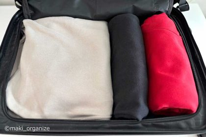 ビシッと硬めにまとまるので、縦向きでしまうことができ、リュックなどの限られた空間を上手に使うことができます。