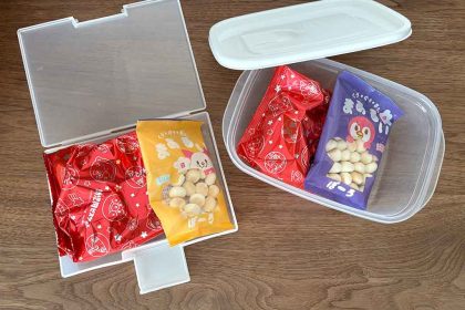 子ども用のおやつを持ち運ぶ際、袋のままだとほかの荷物に当たって割れてしまったり、粉々になったりしてしまうこともあります。食品用の保存容器を使うのが定番ですが、個人的なおすすめは、100円ショップで購入できるはがき収納ケース。厚みがあって頑丈なのと、フタがしっかりしまる点が安心です。