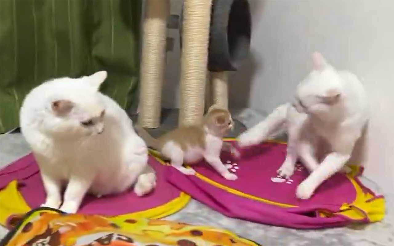 話題の動画には、ねこ用のおもちゃやキャットタワーが並ぶ部屋でくつろぐ、2匹の白ねこと茶白の子ねこが登場します。