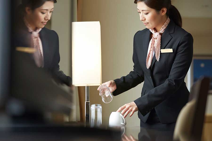さまざまな人が利用するホテル。チェックアウト後の客室では、スタッフが忘れ物を確認したあと、次のお客様を迎えるための準備を行います。