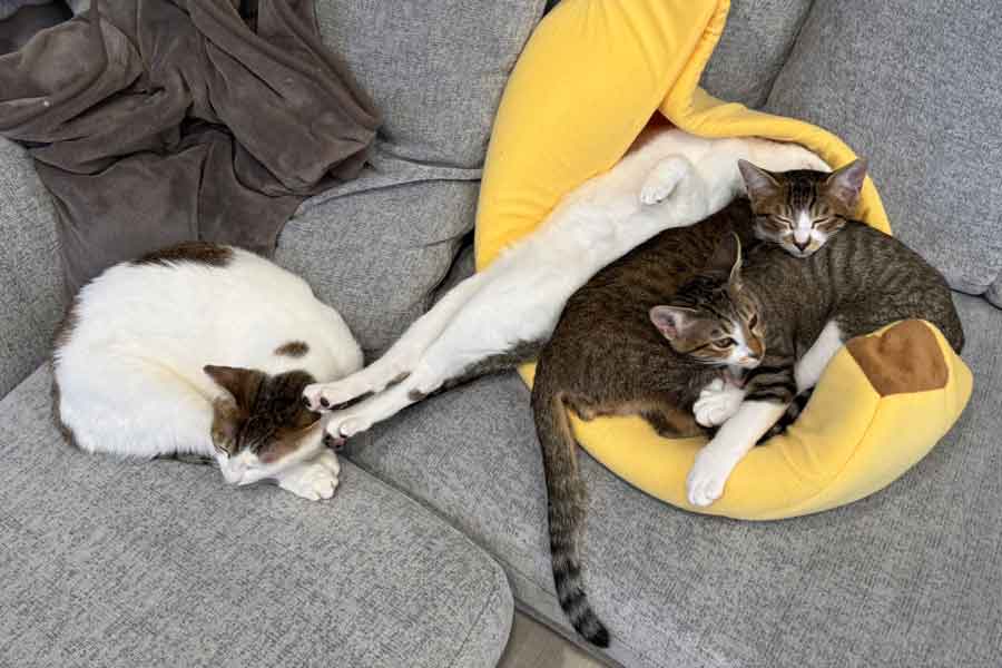 グレーのソファの上にある、黄色いバナナ型ベッド。その中には、ぎゅっと詰め込まれたように眠る3匹のねこがいます。しかし、ベッドから大胆にはみ出すねこが1匹。体をピンと伸ばし、脚をこれでもかと伸ばして仰向けで寝ています。