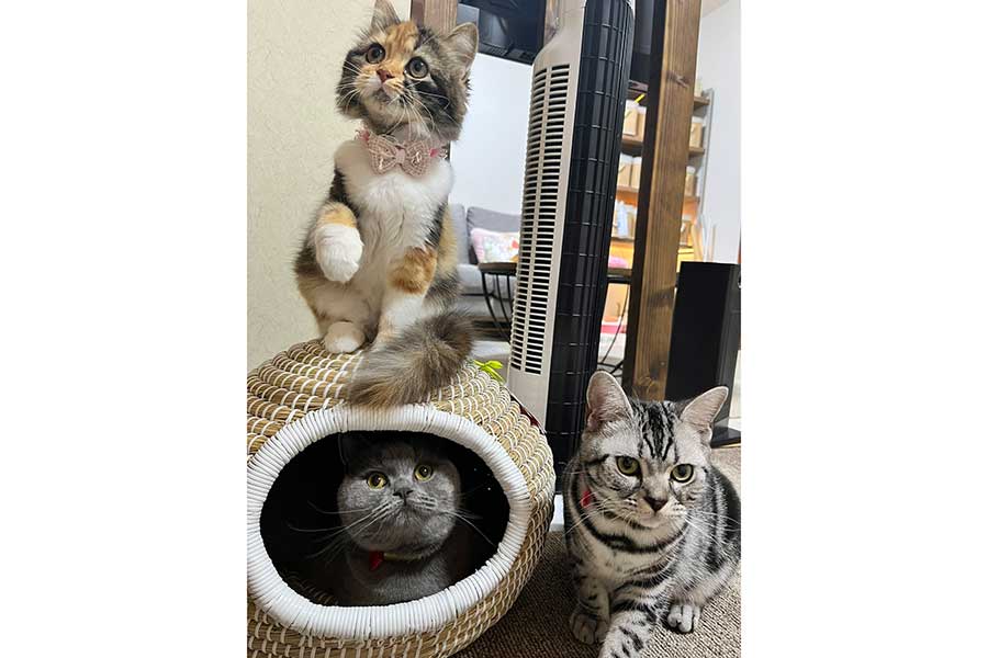 飼い主さんに二度見させたのは、サイベリアンで生後9か月「美美」ちゃん。いたずらっ子で甘えん坊な女の子です。一緒に暮らしているブリティッシュショートヘアの「夢夢」ちゃんと、アメリカンショートヘアの「萌萌」ちゃんとは、三姉妹のように仲良く過ごしています。