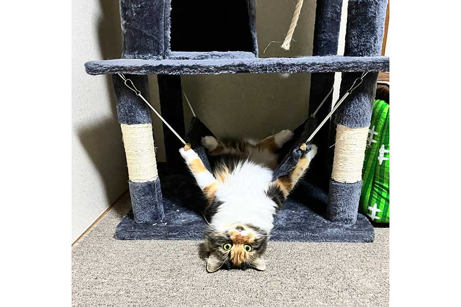 美美ちゃんは、キャットタワーのハンモックがお気に入り。ある日の朝、飼い主さんがキャットタワーに目をやると、美美ちゃんが驚きの体勢で寝ていたといいます。