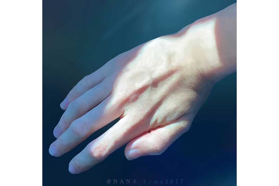軽く曲げた指の影や、爪に当たる光なども丁寧に描かれ、絵とは思えないクオリティ。手のひら全体に細かく刻まれたシワも美しく、皮膚の凹凸が見事に描かれています。