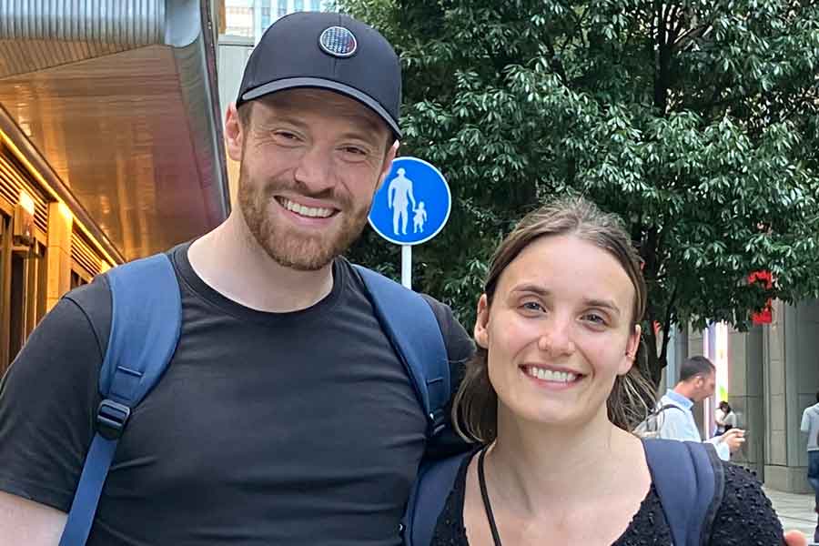 フランスから訪日したジュリアンさんとオセアンさん夫妻。年に2~3回、合計約6週間も旅に出るというほど旅行好きなふたりですが、日本へ来るのは今回が初めてです。3週間滞在し、前半は東京、後半は名古屋や奈良、大阪、京都などをめぐるそうです。