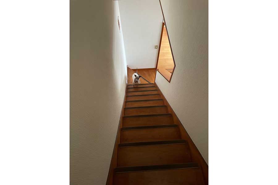 写真には、階段の下からじっと見上げるプットくんの姿が。下から3段目に前足をかけて、心配そうな表情を浮かべています。「許可なく階段を上ってはならない」というルールがありながらも、プットくんが途中まで登ってきてしまったのには、理由がありました。
