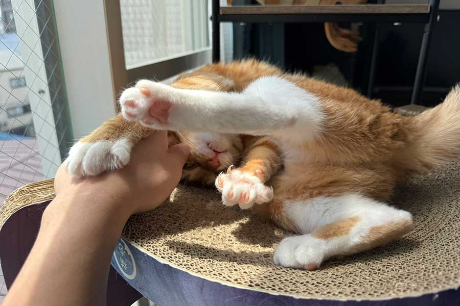 そんなコメントとともに投稿された写真には、リラックスして爪とぎの上に横たわる茶トラのねこが写っています。飼い主さんの手を片方の前足でぎゅっと掴んでいますが、問題はもう片方の前足。足の裏を上にした状態で、鋭く伸びた爪をしっかりと見せています。