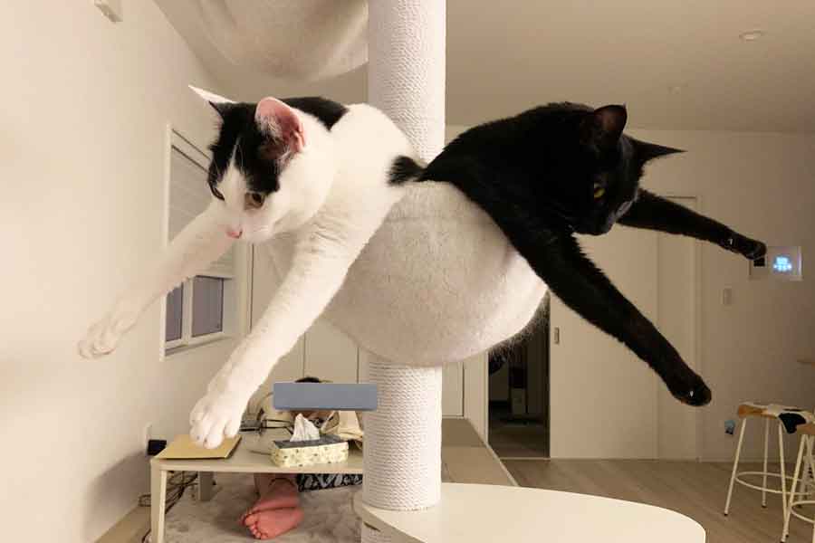 そんなコメントとともに投稿された写真に写る、2匹のねこ。左側は白黒、右側は黒ねこです。2匹とも、キャットタワーに取り付けられたハンモックから、前足をまっすぐに伸ばしています。