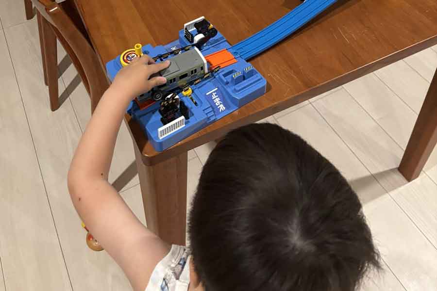 ダイニングテーブルの上に広げられた鉄道玩具。小さな男の子が青いレールの上に列車を乗せて、今まさに出発させようとしています。