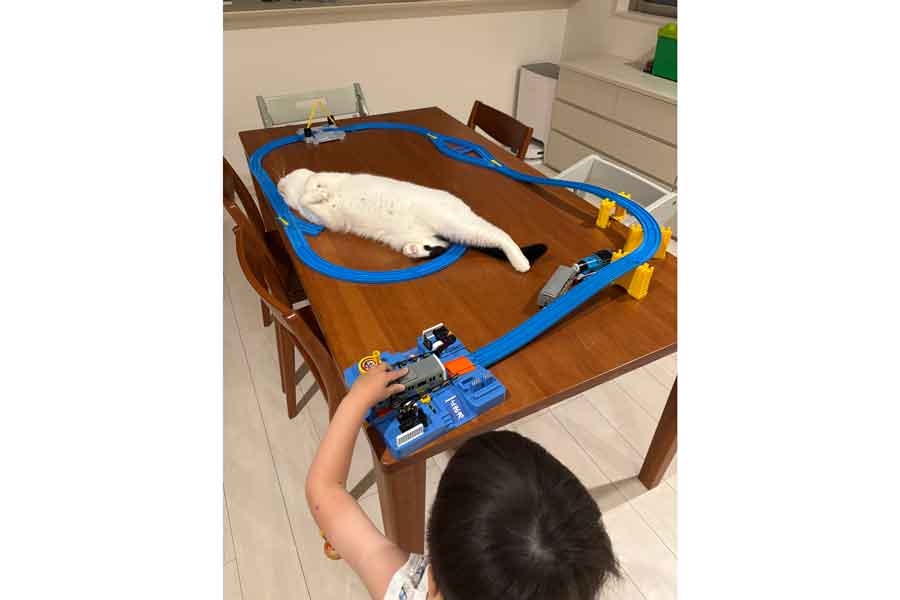 大人に手伝ってもらいながら、2歳の息子さんが玩具を組み立てるのにかかった時間は10分ほど。飼い主さんによると、たけるくんは、レールの組み立てが始まったときから寝そべっていたそうです。息子さんがせっせと作業する様子をずっと見ていたにもかかわらず、完成したレールの上から動く気配はありませんでした。