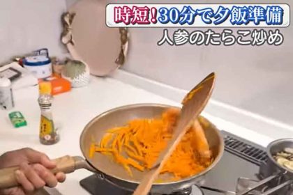 彩りも栄養バランスも考えられた内容ですが、「お弁当にも入れられるメニューで、全部時短で簡単」と話す小倉さん。2品目の「ニンジンのたらこ炒め」を作っていると、雨で部活が休みのため手が空いていた長男がキッチンへやってきて、ニンジンを炒めるお手伝いを始めました。