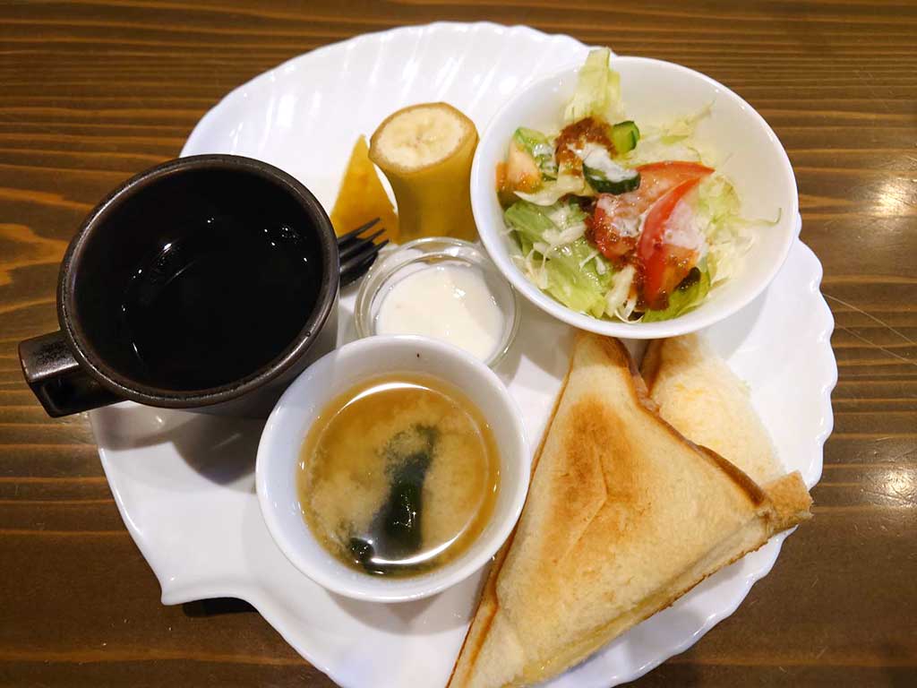 続いて、高知駅北口にある「マルタン」は1971年開店の老舗。お店はリニューアルしていますが、店内と手書きのメニューは昭和の雰囲気を感じます。こちらでは「ホットサンドモーニング」をチョイス。ハムとチーズのホットサンドにサラダ、バナナ、ヨーグルト、コーヒー、そしてみそ汁付きで630円です。