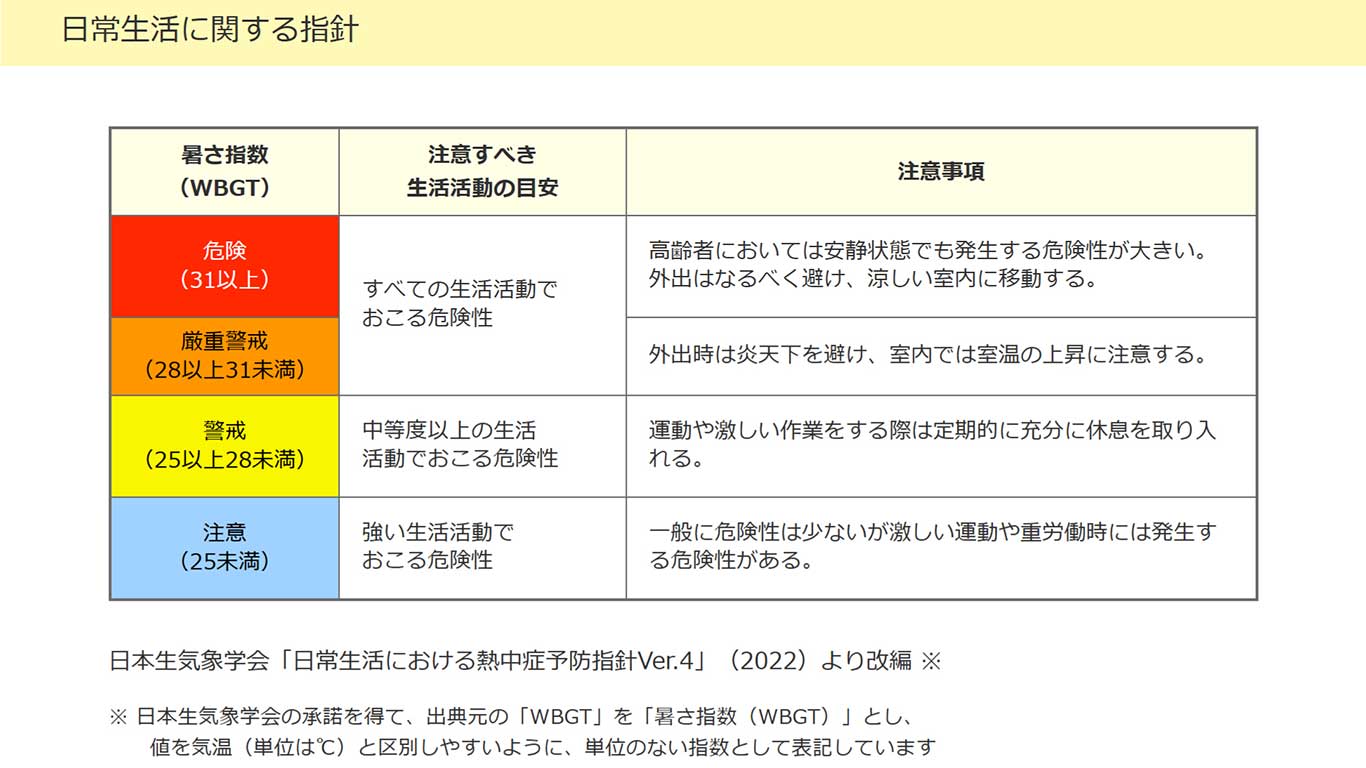 「環境省はWBGTに基づいて、4段階の『日常生活に関する指針』と5段階の『運動に関する指針』を定めており、WBGTに応じた対策を示しています。どちらの指針も28以上は『厳重警戒』とされ、外出時には炎天下を避けることや激しい運動の中止を呼びかけています」