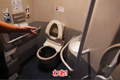 新幹線の速さに圧倒されながらも、デッキでマップを開いて、富士山の横を通過するのを楽しみに待つブルースさん。ところが、残念なことに富士山を見ることはできませんでした。ブルースさんは気を取り直して、ジェイソンさんが見せたかったという多目的トイレを見学することにしました。