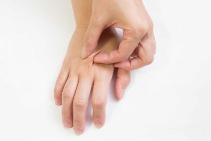 1. 手の甲を、ハンカチを拾い上げるようにつまみ上げてすぐに離す