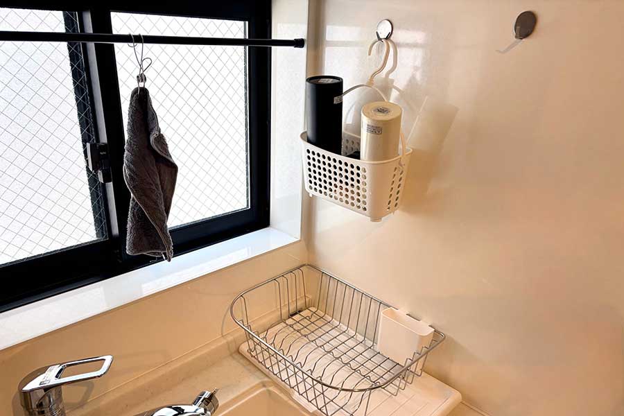 また、食器を洗ったあとの水気も、カビが生えやすくなる原因に。食器類に比べて乾きにくい水筒や保存容器などの容器類は、ピンチカゴに吊るすのがおすすめです。窓の近くに吊るせば、風通しが良く乾きやすいため、布巾で拭く手間もカットできます。