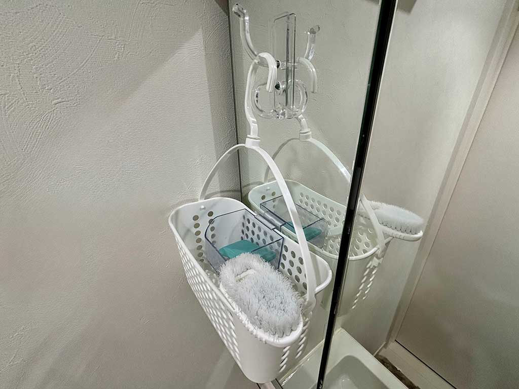 浮かせて収納したほうが、乾きが早いのもうれしいところ。ちなみに、石けん入れは100円ショップの「キッチン小物の水切りグッズ」を使うと、ダブルの効果でしっかり水切りできます。