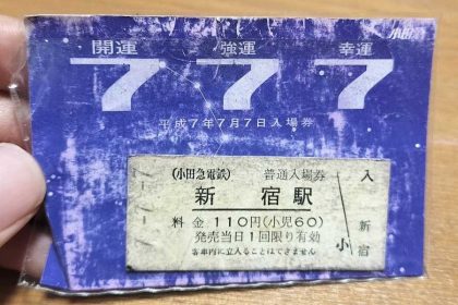 「開運」「強運」「幸運」の3つの「7」がスリーセブンとしてあしらわれた、ゾロ目を記念した小田急線の記念入場券。歴史を感じさせる切符に、SNS上では「めちゃくちゃ素敵です!」「すごいですね!! よく取ってありましたね」「30年財布を無くさない強運と幸運かな」「30年前の切符 大事に保存しましょう」など、驚きの声が多数寄せられています。