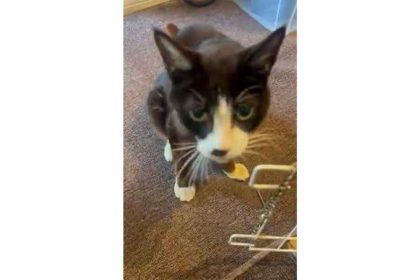 そんなコメントとともに投稿された1本の動画。そこには、きりりとした端正な顔立ちのハチワレねこが映っています。