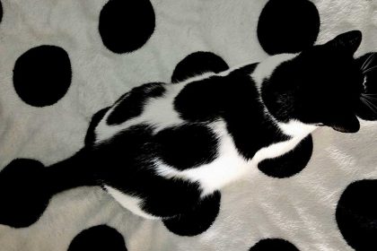 そんなコメントとともに投稿された写真には、白地に大きな黒のドット柄があしらわれたブランケットが写っています。しかし、よく見ると、その上にはねこの姿が。