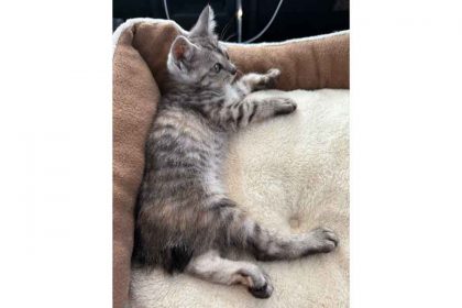 そんなコメントとともに投稿された写真には、クリーム色のふかふかとしたベッドに横たわる1匹のキジトラの子ねこが写っています。保護されたばかりとは思えないほど、安心してくつろいでいる様子が伝わってくる一枚です。