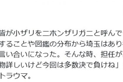 「小学生の頃クラス皆が小ザリをニホンザリガニと呼んでいたので、何回育ててもアメザリ化することや図鑑の分布から埼玉はあり得ないと説明したら僕以外の子達と言い合いになった。そんな時、担任が出てきて裁定を下す。『中村は生き物詳しいけど今回は多数決で負けね』と。あれは正直今でもトラウマ」