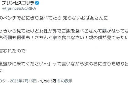 投稿は1.5万件のリポスト、28万件もの“いいね”を集めるなど話題に。「そんなやばい人がいるんですか?!」「わたしも外でおにぎり食べてたら、通りすがりのおばあさんに、まあこんなところでみっともない…と捨てゼリフ? 言われたことあります」「そのおばあさんはピクニックや遠足やお花見とか経験ない感じなのかな?」など、驚きや共感の声が相次いでいます。