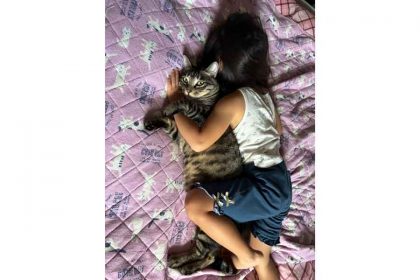 そんなコメントとともに投稿された写真には、ベッドの上でキジトラねこをぎゅっと抱きしめて眠る女の子が写っています。