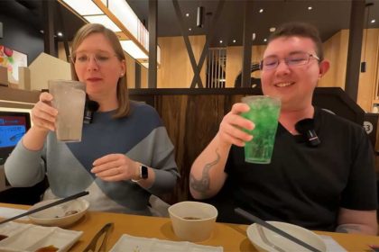 ジェレミさんが選んだドリンクはメロンソーダ。レナさんが「メロンソーダは子どもに好きな子は多いよ。ドイツのチャンネル視聴者にもメロンソーダは大人気だよ」と話すと、ジェレミさんは「甘すぎない飲み物だから、おいしいと思うよ」と笑います。