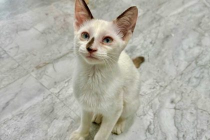 投稿に添えられた写真には、キャリーケースに入った子ねこが写っています。白い毛並みに黒の模様が浮かび、とくに鼻の上にある濃い模様が印象的です。保護されたばかりで少し不安そうな様子ですが、好奇心を感じさせるまなざしをカメラに向けています。