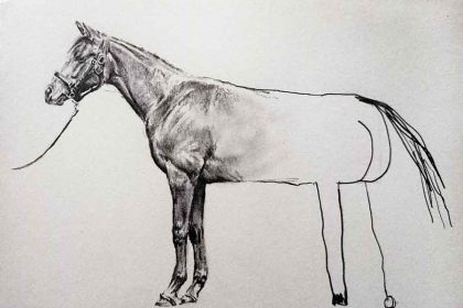 絵の左側、馬の頭から首差し、さらに前肢や胴体にかけては、鉛筆の濃淡を巧みに使って写実的に描かれています。毛並みや筋肉の質感が細かく表現されており、本物の写真のように見えるほどの完成度です。