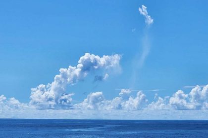 1枚目の写真には、青く澄んだ空に浮かぶ雄大な入道雲と、その下に静かに広がる水平線が写っています。向かって右側が上空へ向かってダイナミックに伸びていますが、ひときわ目を引くのは、一番高い位置にある小さな雲の塊です。下に向かって勢い良く白い筋が伸びており、そこだけ強い雨が降っていることがわかります。