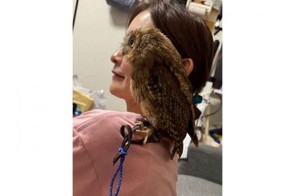女性の左目の位置にぴったりと重なったフクロウ