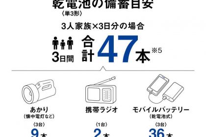 「やはり、防災備蓄用には保存期間の長い製品をおすすめします。大型の懐中電灯は単1形電池を使用するものが多く、災害時には単1形電池の需要が高まりますが、まずはご家庭の製品がどの電池を使っているか確認することが大切です。汎用性のある単3形乾電池の場合、目安となる3日分の備蓄量は1人あたり17本。内訳は通信・情報収集に欠かせないスマートフォン充電用が12本、明かり専用に3本、ラジオ用に2本で、3人家族であればラジオは共通として3日間で47本という計算になります。『EVOLTA NEO』は保存期間10年(単1形~単4形のみ)となっておりますが、保管場所や保管温度によっても異なるので乾電池も非常食と同じように使った分を買い足していくローリングストックがおすすめです」