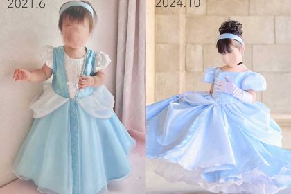 そして2024年10月には、より鮮やかなブルーに生まれ変わりました。4歳になった娘さんが見事に着こなし、優雅にポーズを取っています。初期作品も十分に美しいですが、3年後のドレスは、まるでプロが手がけたかのよう。生地の質感、シルエットの美しさ、細部の装飾まで、すべてが格段にレベルアップしています。
