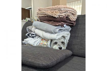 そんなコメントとともに投稿された写真には、ソファの上に積み重ねられたタオルが写っています。しかし、下のほうをよく見ると、いぬの顔がありました。