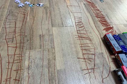 一方、2枚目には、同じ赤茶色のクレヨンで垂直に伸びる線路を描かれた白壁が写っています。フローリングや壁を大きなキャンバスに見立てて、部屋全体を鉄道の世界にしようとしていたのかもしれません。