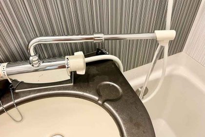 そんなコメントともにまさやんさんが投稿した写真には、ホテルのユニットバスの洗面台と浴槽の一部が写っています。温度調節と水量調節ができる2つのハンドルを持った混合水栓から、銀色の蛇口とホースシャワーが伸びていますが、洗面台の蛇口が浴槽に向いているものの、明らかに短すぎてお湯をためられそうにありません。