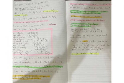 そんなコメントを添えて、みっかかんさんが引用リポストしたのは、自身が2023年2月9日に投稿した写真付きの投稿。3枚の写真には、びっしりと書き込まれた勉強ノートが写っています。英文と日本語訳、使える表現や慣用句などが箇条書きされ、ところどころにピンクやイエローなど4色の蛍光マーカーが引かれています。