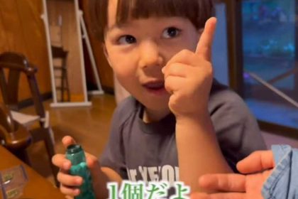 すると、リノくんは優しく「ママ、1個食べてみる?」と、ボトルからラムネを1粒出します。言葉にこそ出しませんでしたが、ラムネ菓子をすっかり気に入った様子。Amiさんに差し出しながらも「1個だよ、1個」と念を押す姿は、なんともかわいらしく映ります。