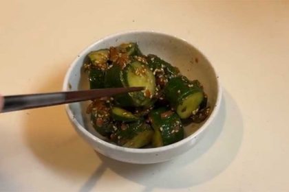 一方、「日本に染まったあと」は、日本の食材をふんだんに使った一品に変化。輪切りにしたキュウリをジップ付き保存袋に入れ、包丁でたたいた梅干しも入れます。残った種を口に入れ、テロップでは「この酸っぱさがたまらない!」と、梅の味わいを存分に楽しんでいる様子。