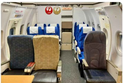 そんなコメントとともに投稿されたのは、自宅に再現された、飛行機の客室の写真です。中央の狭い通路を挟んで、左右に座席が並んでいます。ヘッドレストに白いカバーがかけられた青い布地のシートのほか、座面が黒革の重厚感のある座席もあり、グレードも分かれている様子。ゆるやかに曲線を描いた白い壁には、いくつか窓も配置されています。