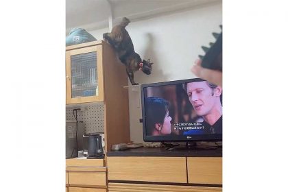その目はブラシをロックオン。迷いのない足取りでテレビの横をすり抜け、飼い主さんのもとへ一直線に向かってきます。最後は飼い主さんにブラッシングされてうっとり。とても気持ち良さそうにしています。