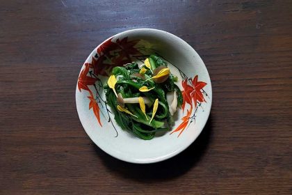 過度な装飾がないものが多いので中央に和菓子を乗せたりしても喧嘩しません。京焼は上品でかわいらしい柄も多いので私のお店でも一番人気なんですよ。今回は紅葉の赤に映えるのは緑かなと思って、春菊としめじの煮浸しに菊をあしらって秋を表現してみました。どうでしょう? フライングで紅葉狩りになっていますかね?」