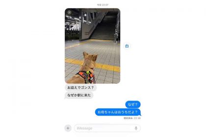 そんなコメントとともに投稿された写真には、メッセージのやりとりをする様子が写っています。そのなかには、駅の階段前に佇むいぬの後ろ姿をとらえた写真も送られていました。