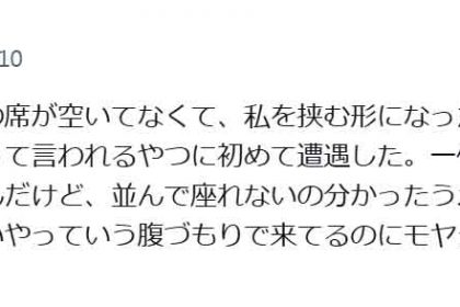 「映画館で隣同士の席が空いていなくて、私を挟む形になった2人組に座席交換してくださいって言われるやつに初めて遭遇した。一個横にズレること自体はまぁいいんだけど、並んで座れないの分かったうえで隣の人に交換してもらえばいいやっていう腹づもりで来てるのにモヤっとする。これ心狭いんかな」