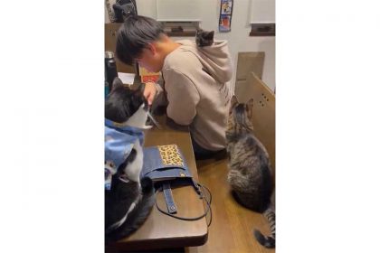 「にぃにのフードにすっぽり」 → “特等席”に収まった子ねこ 先住ねこたちの羨ましそうな視線に3.2万“いいね”