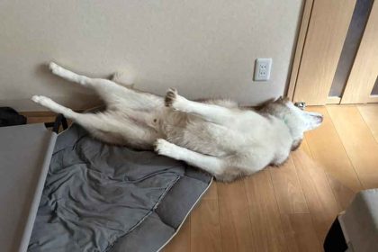 そんなひと言が添えられた写真には、シベリアンハスキーが仰向けで無防備に寝転がる姿が写っています。手足をピーンと伸ばしてお腹を見せており、完全にリラックスしている様子が伝わってきます。実は床には暖房が入っており、初めて体験した床暖房のぬくもりに、すっかり魅了されてしまったようです。