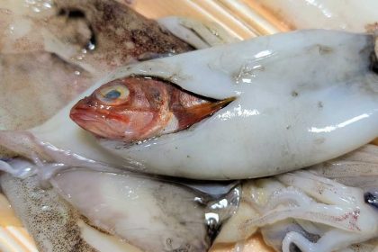 そんなコメントとともに投稿された1枚の写真。そこに写っているのは、イカをさばいている途中の様子です。イカの胴体に入った切れ目から、なんと赤みがかった魚が顔を覗かせています。